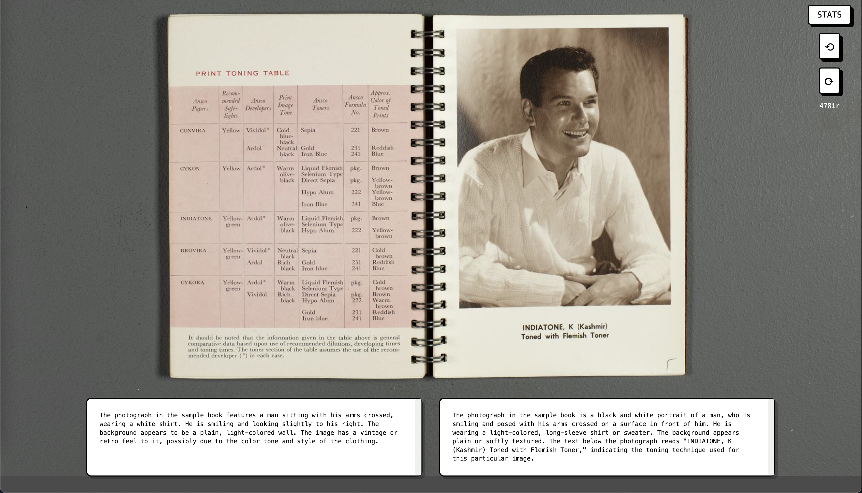Our sample books are always imaged in an upright orientation. But in some cases, the photographs within are mounted sideways, and we did not correct for this before passing these images to the models. Some photos are damaged, some are pictured on pages together with lots of irrelevant text, some of the photos are very small, and many have visual content that is ambiguous or otherwise difficult to parse. This made it easier to choose between competing models, because many performed poorly in these conditions.