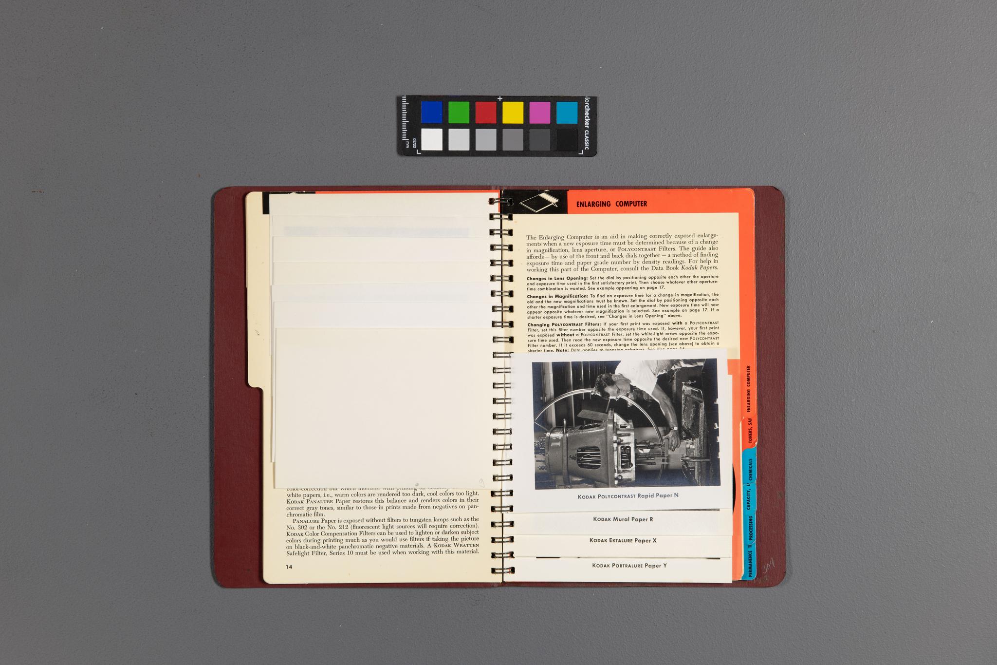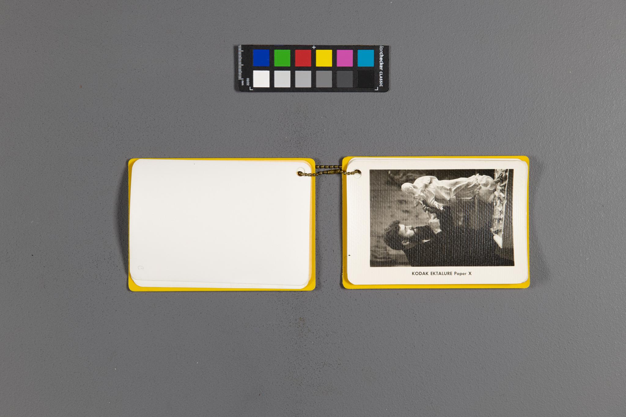 There are two objects in this image. One is a color checker, and the other is a photographic sample book, open to a page containing a photograph. Give a detailed description of the photograph.