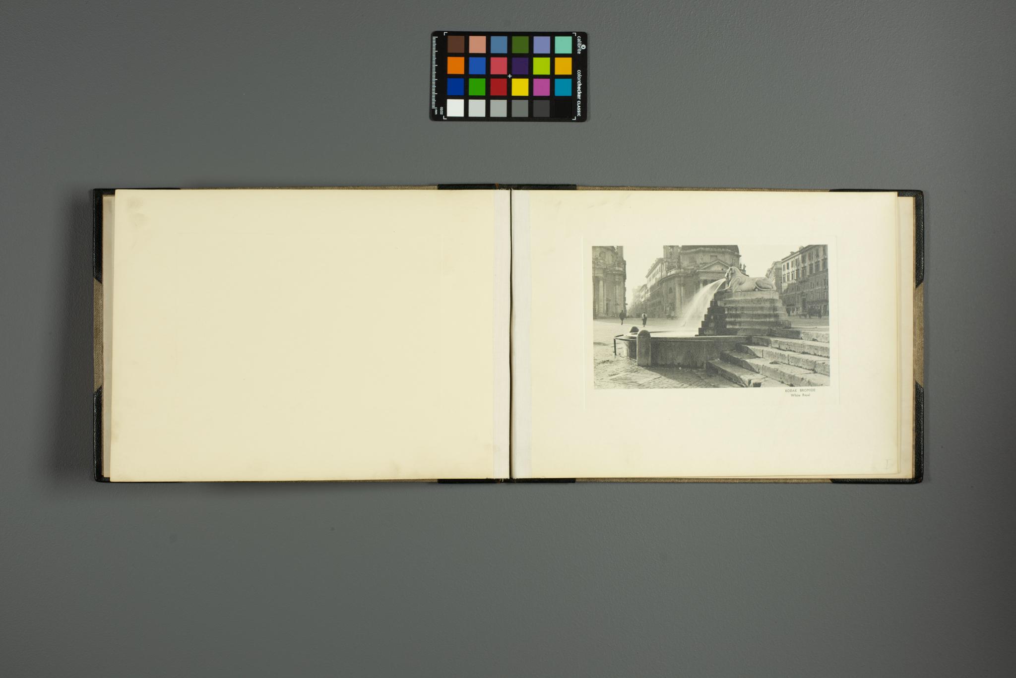 The photograph in the open sample book shows the iconic Trevi Fountain in Rome, Italy. This famous Baroque masterpiece is captured in all its grandeur, with its elaborate sculptural elements and cascading water...The Trevi Fountain's central feature - a large seahorse-drawn chariot - is likely visible, though details may be somewhat obscured due to the nature of the photograph. The fountain's ornate architecture and the play of light on the water create a captivating visual composition. This photograph beautifully captures one of Rome's most beloved landmarks, showcasing its architectural splendor and the enchanting atmosphere it creates in the heart of the city.